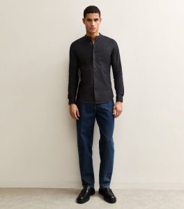 This muscle fit black shirt features a classic grandad collar for a relaxed finish. Pair the cotton poplin style with smart trousers at work or add jeans for a more laid-back vibe.